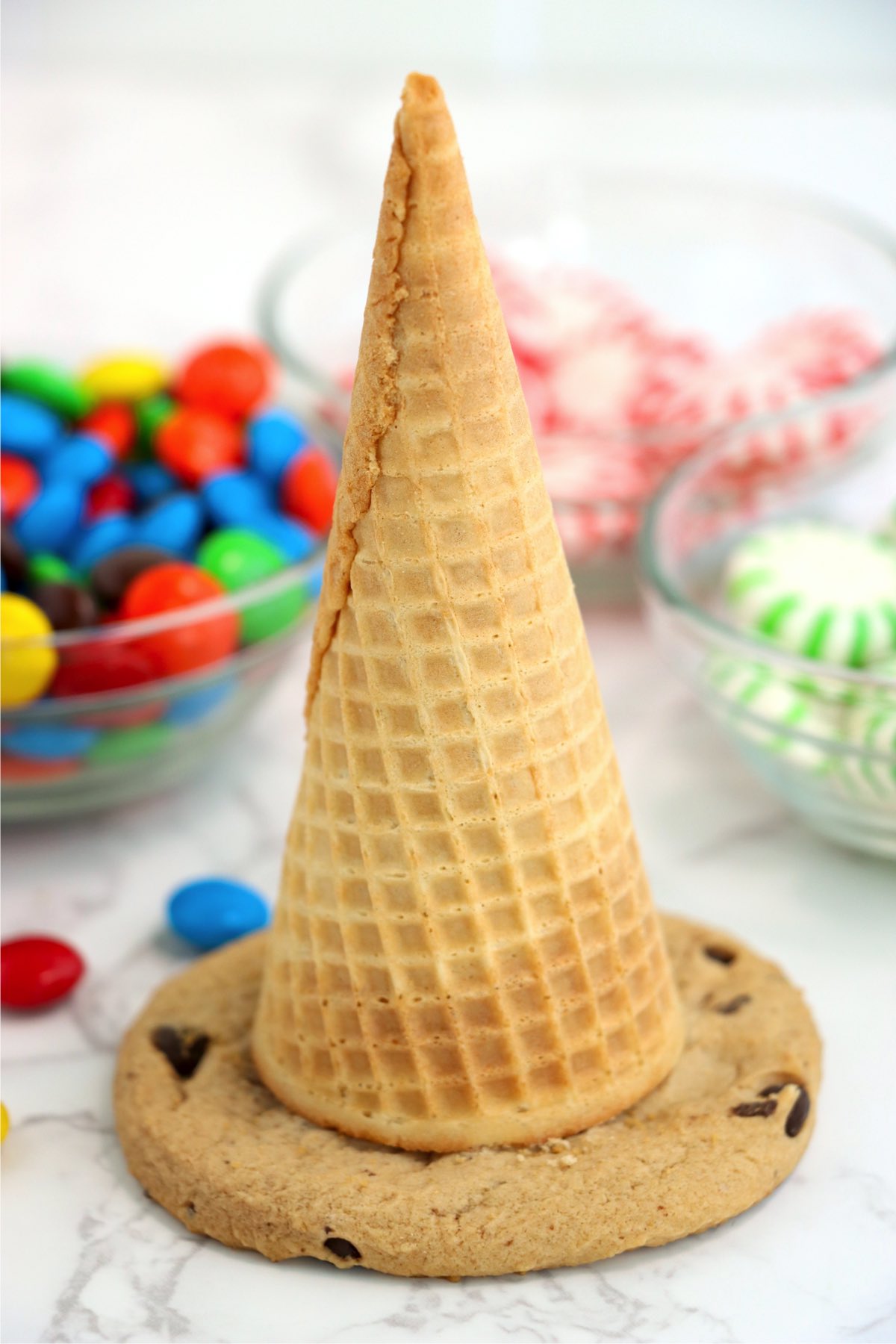 - Place a cookie over top to hold the candy in. Next, gently flip it over so the candy remains inside the cone.