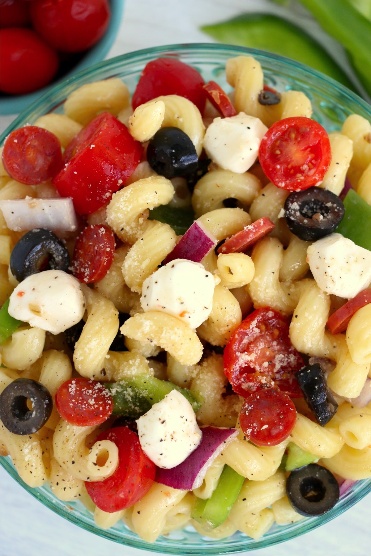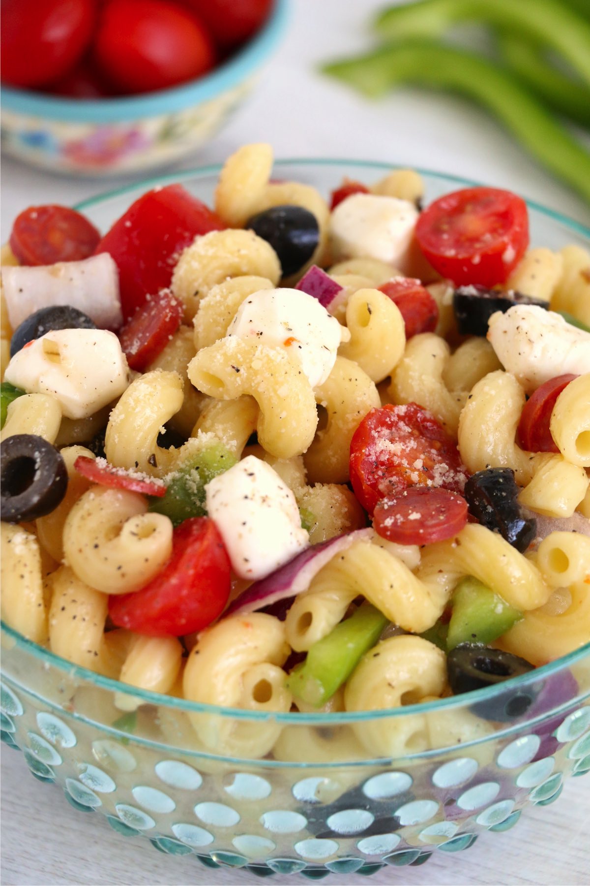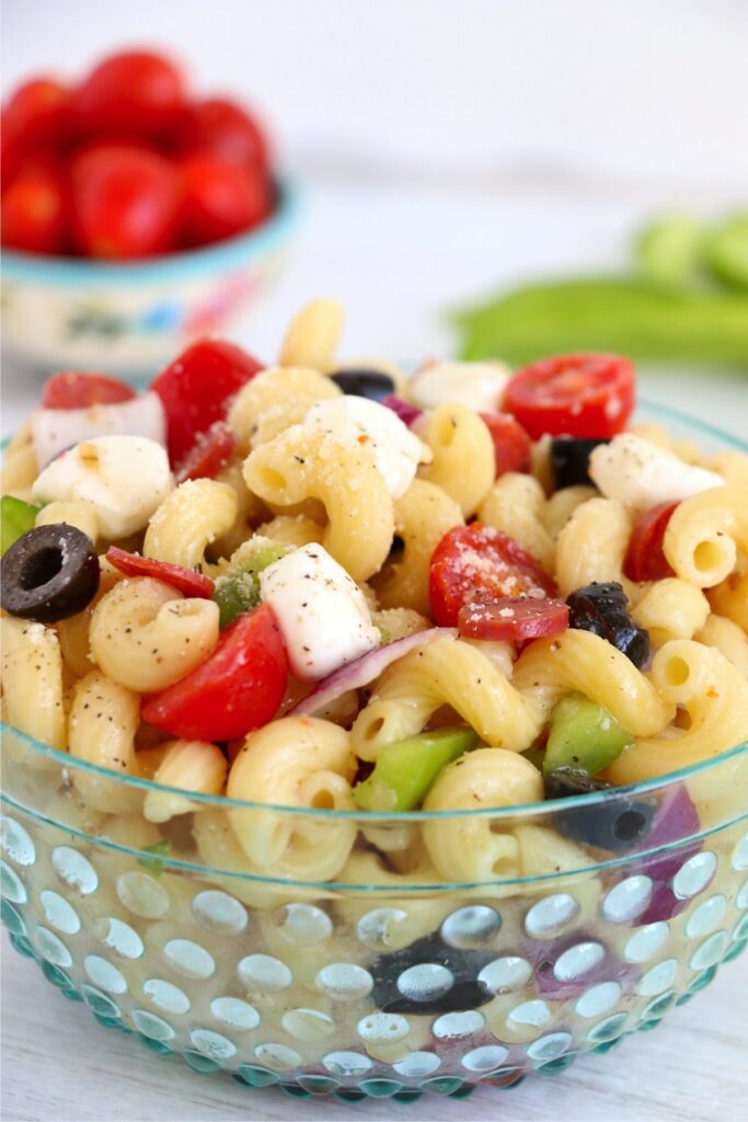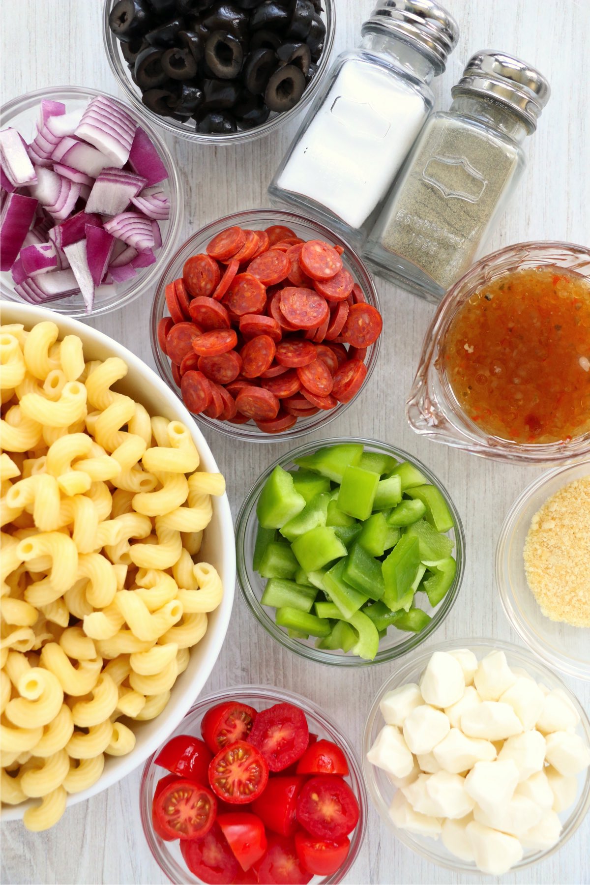 - Combine cooked pasta, cherry tomatoes, green peppers, olives, onions, pepperonis, Italian dressing, salt, and pepper in a large mixing bowl.