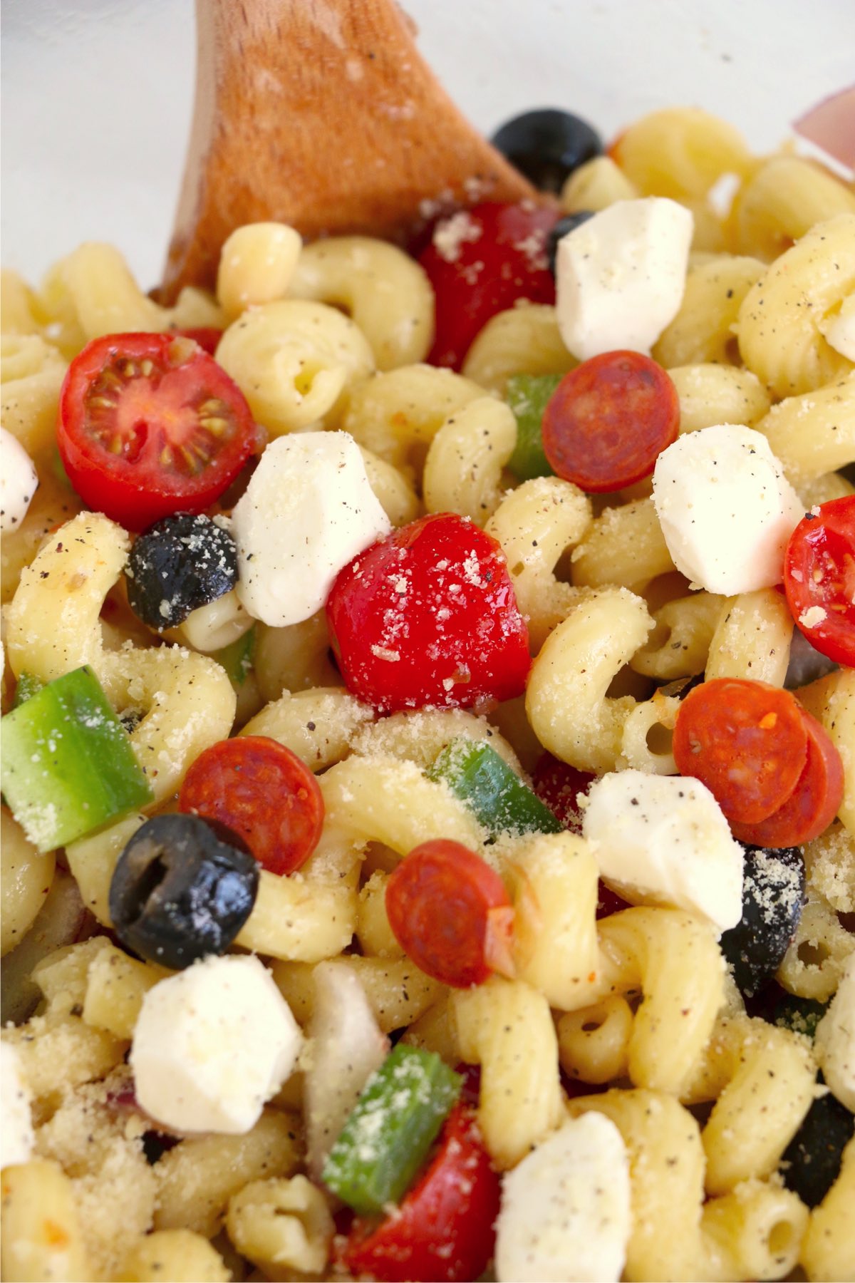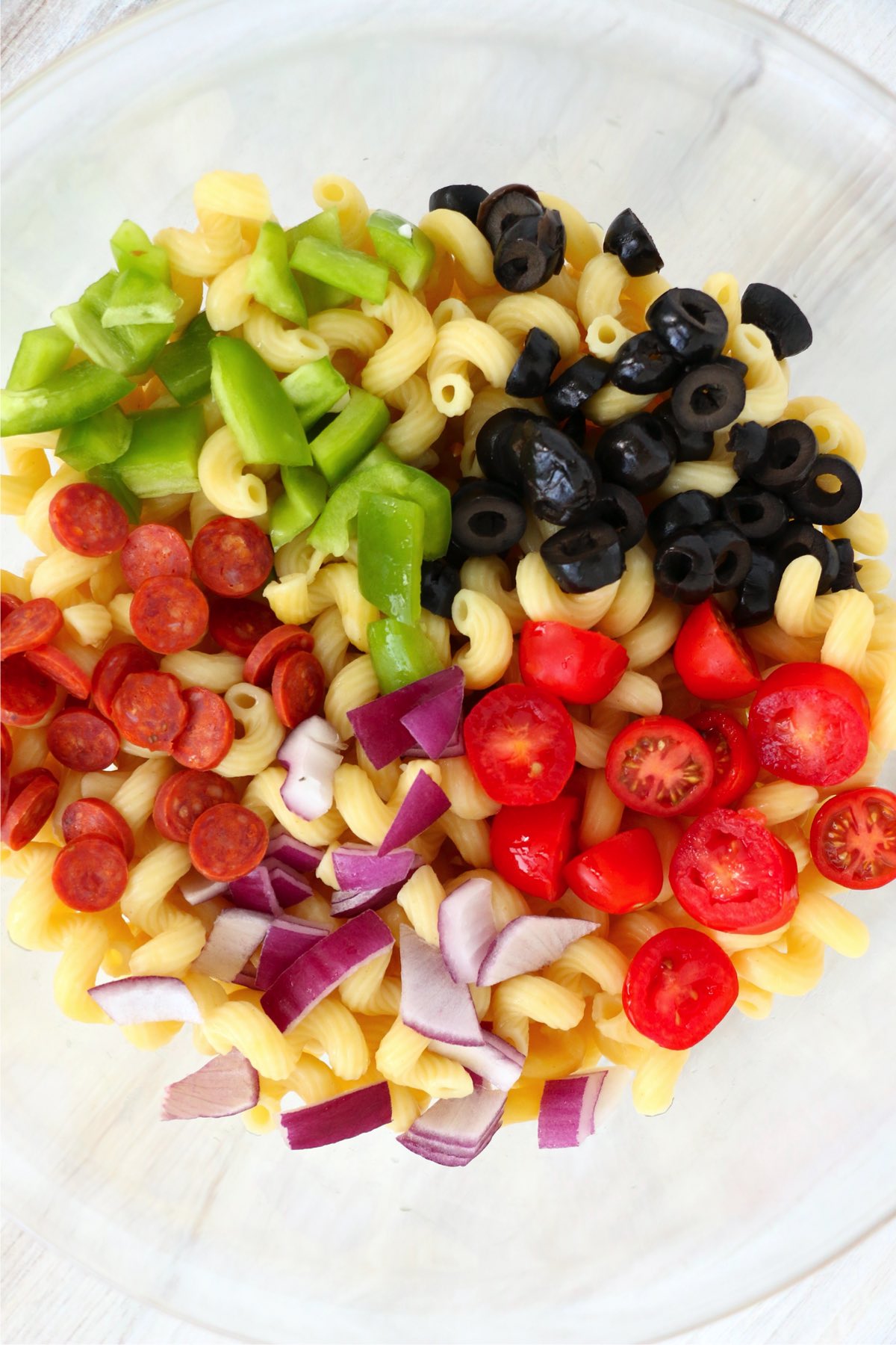 Step 1: Combine cooked pasta, cherry tomatoes, green peppers, olives, onions, pepperonis, Italian dressing, salt, and pepper in a large mixing bowl.