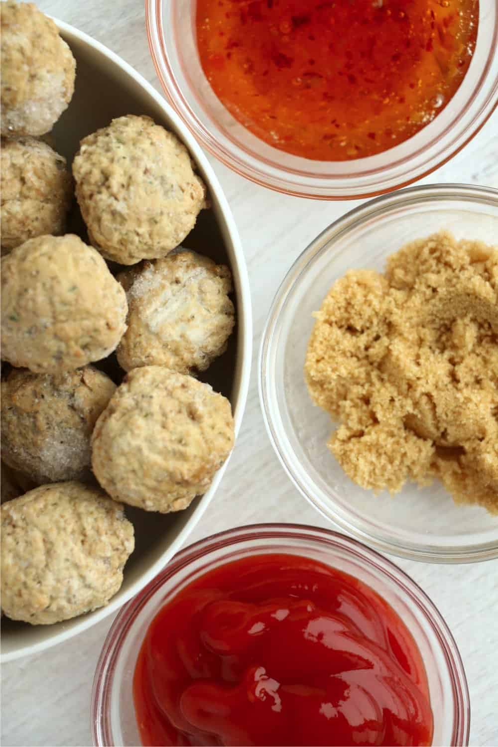 Simply place your frozen meatballs in your crock pot. Whisk the sweet chili sauce, ketchup, and brown sugar together and pour it over top. Stir everything together .