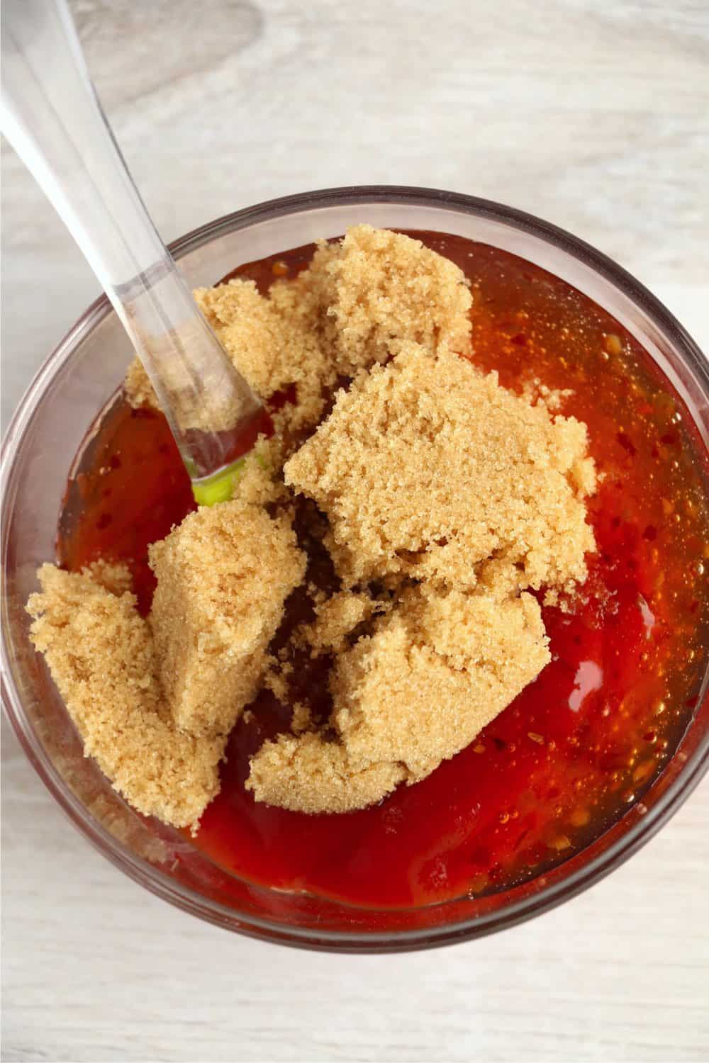 Next, we have to prepare the sauce. Whisk the sweet chili sauce, ketchup, and brown sugar together in a small bowl until the consistency is uniform.