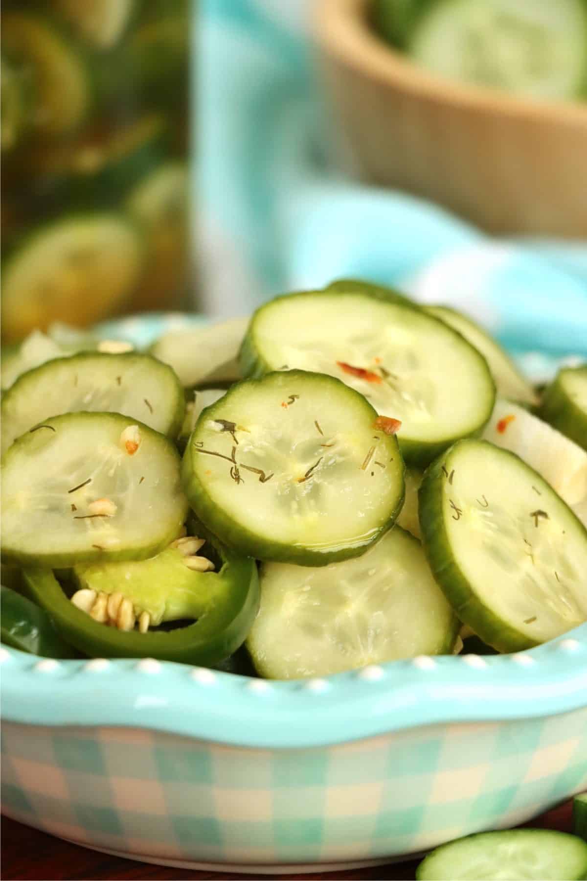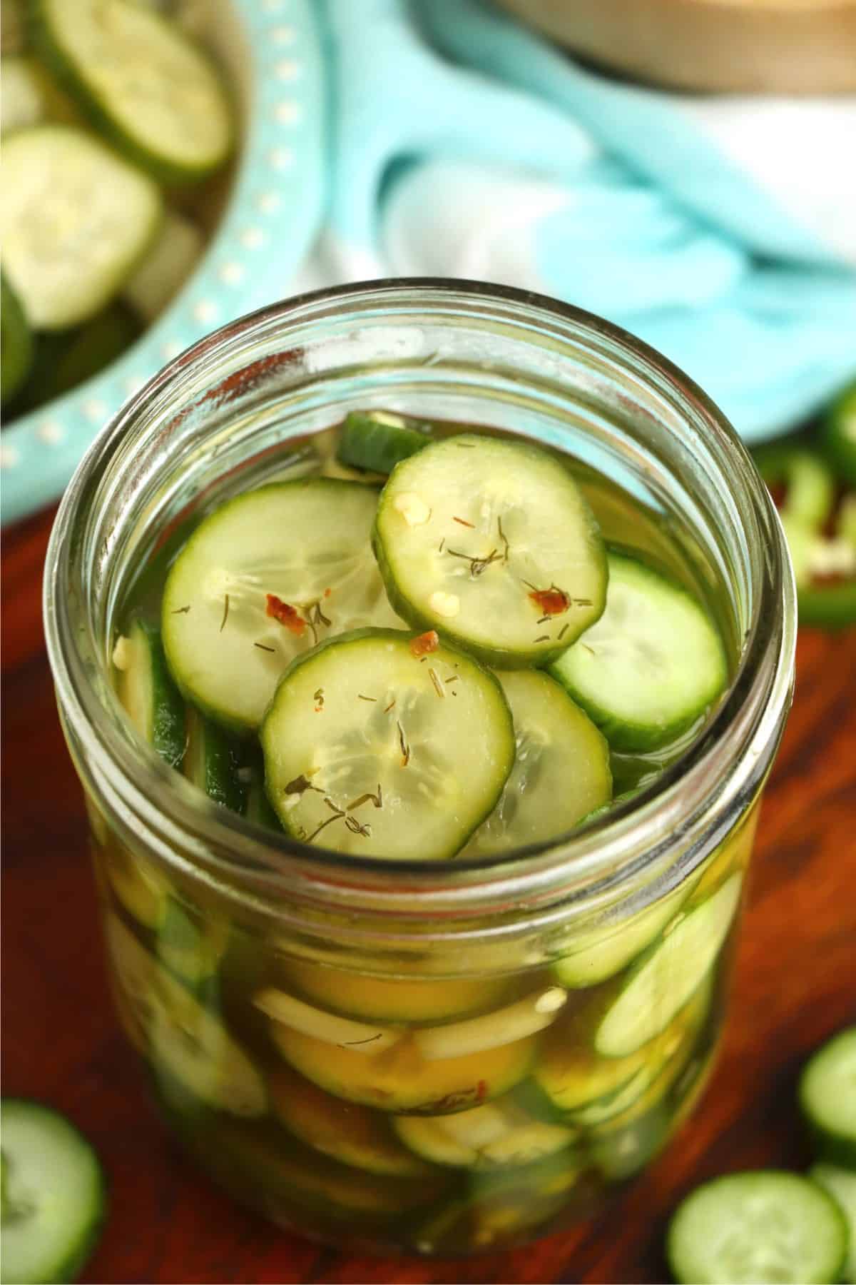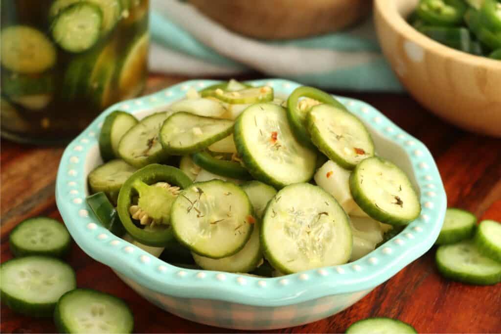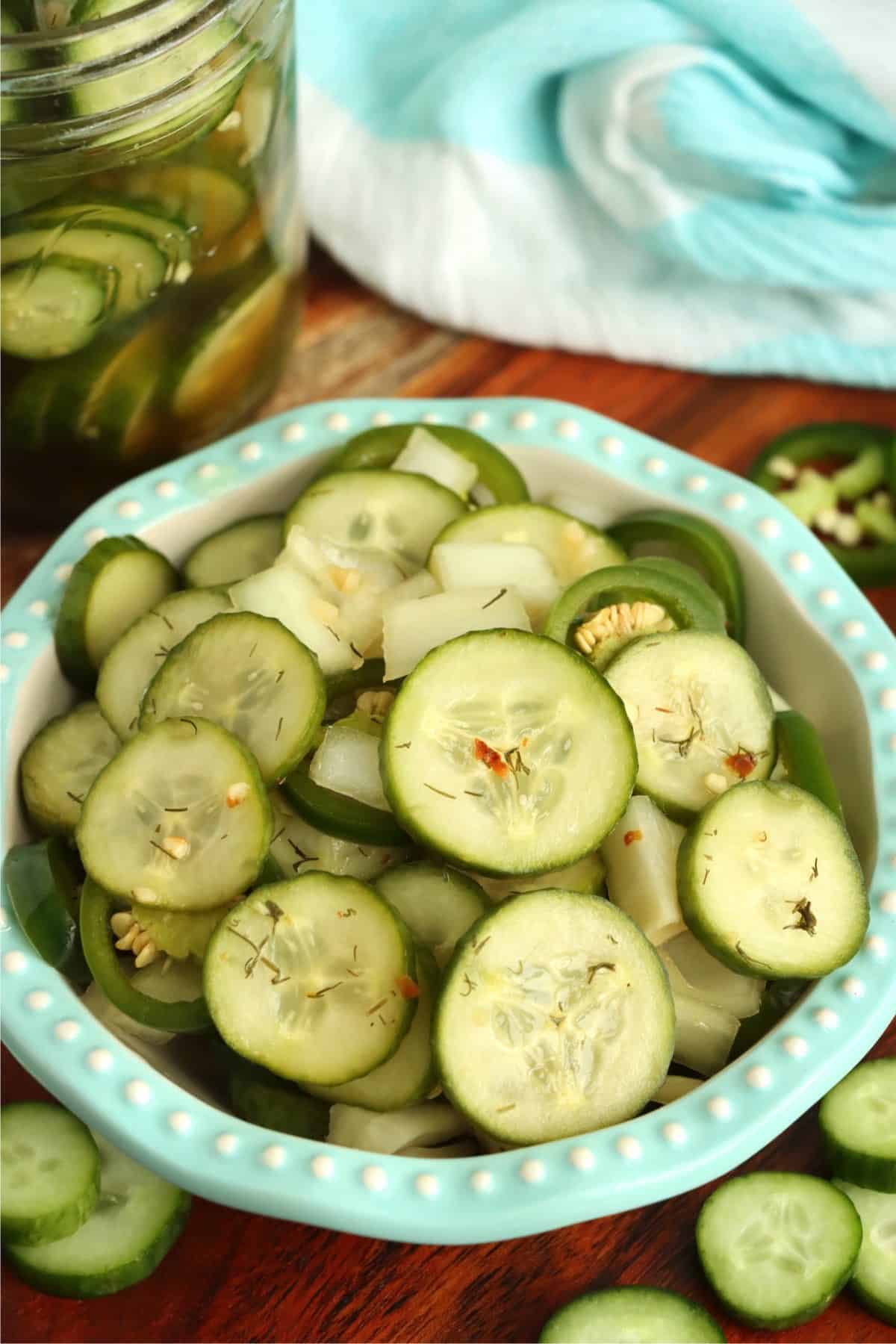 Sweet and spicy pickles are simple refrigerator pickles made with sugar, salt, onions, garlic, and jalapeno peppers.