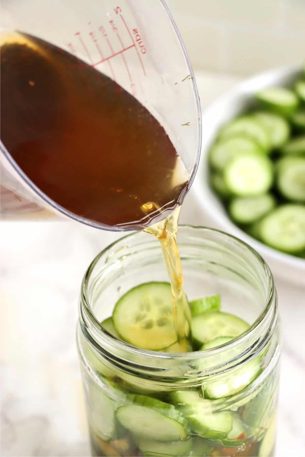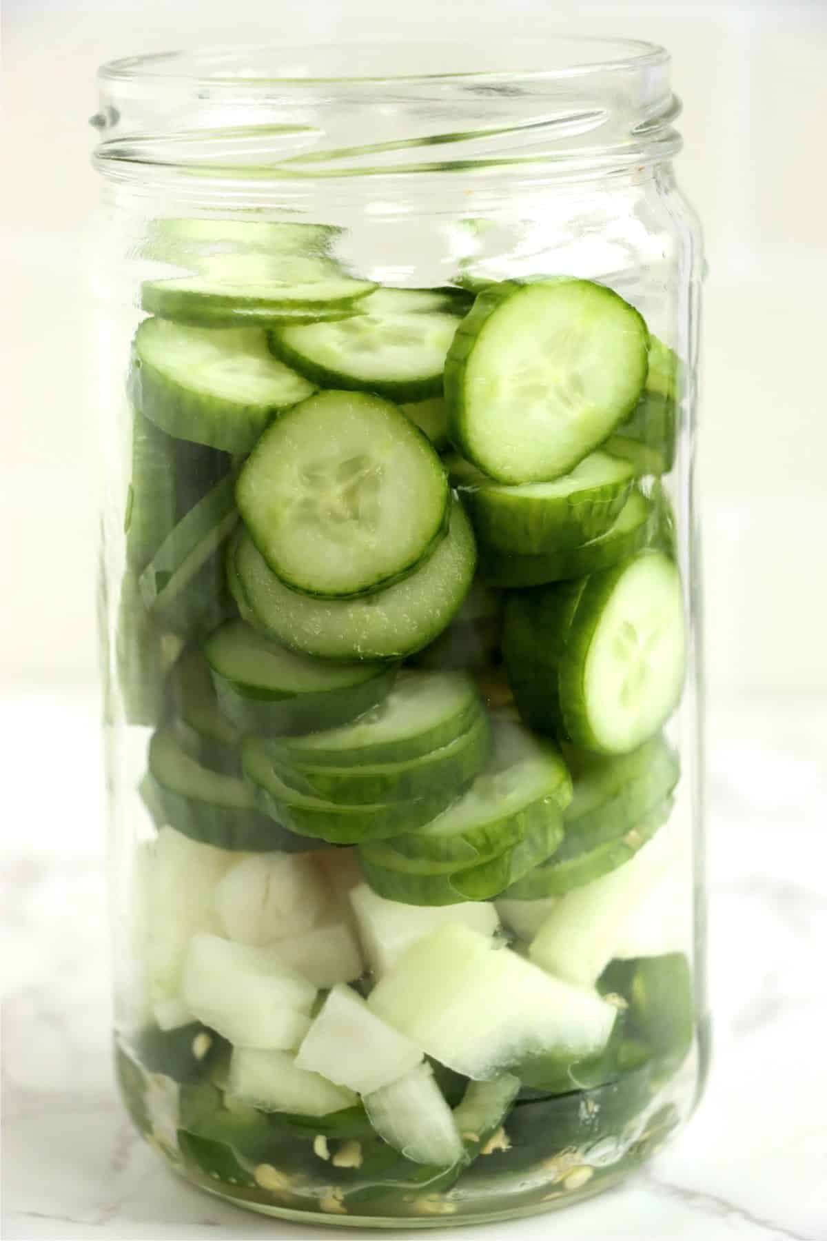 - Put cucumbers, jalapenos, onions, and garlic in a large jar or three small jars.