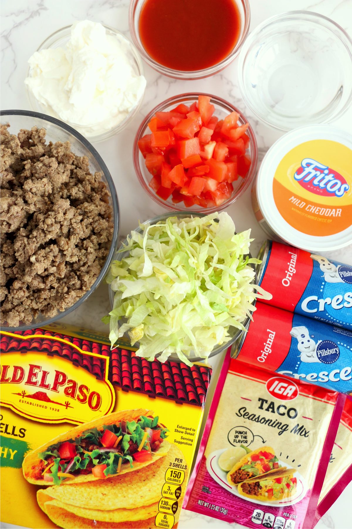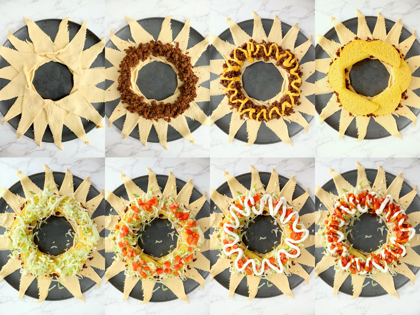 - In this order, add ingredients to the crescent ring: ground beef, cheese sauce, hard taco shells, lettuce, tomatoes, sour cream, and taco sauce.