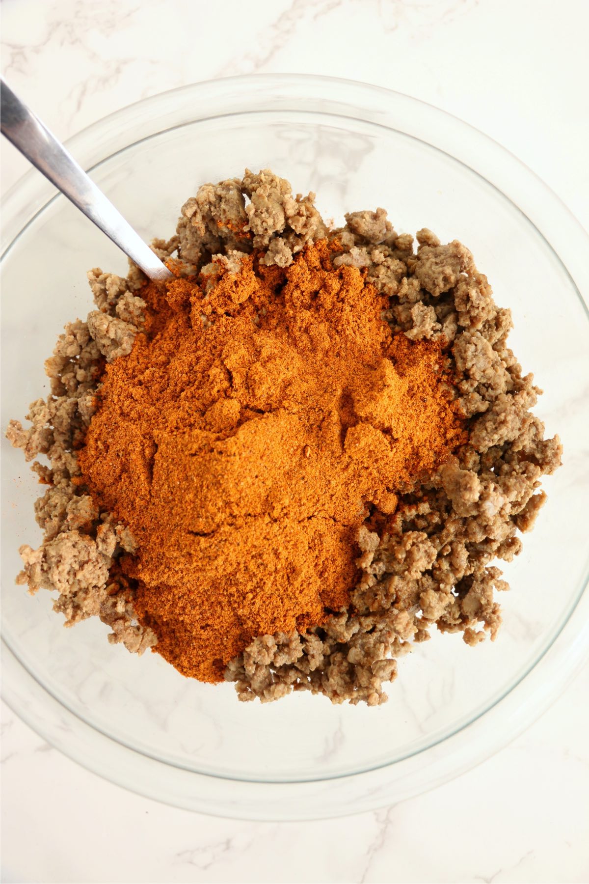 Step 3: In a medium mixing bowl, combine ground beef, taco seasoning, and water.