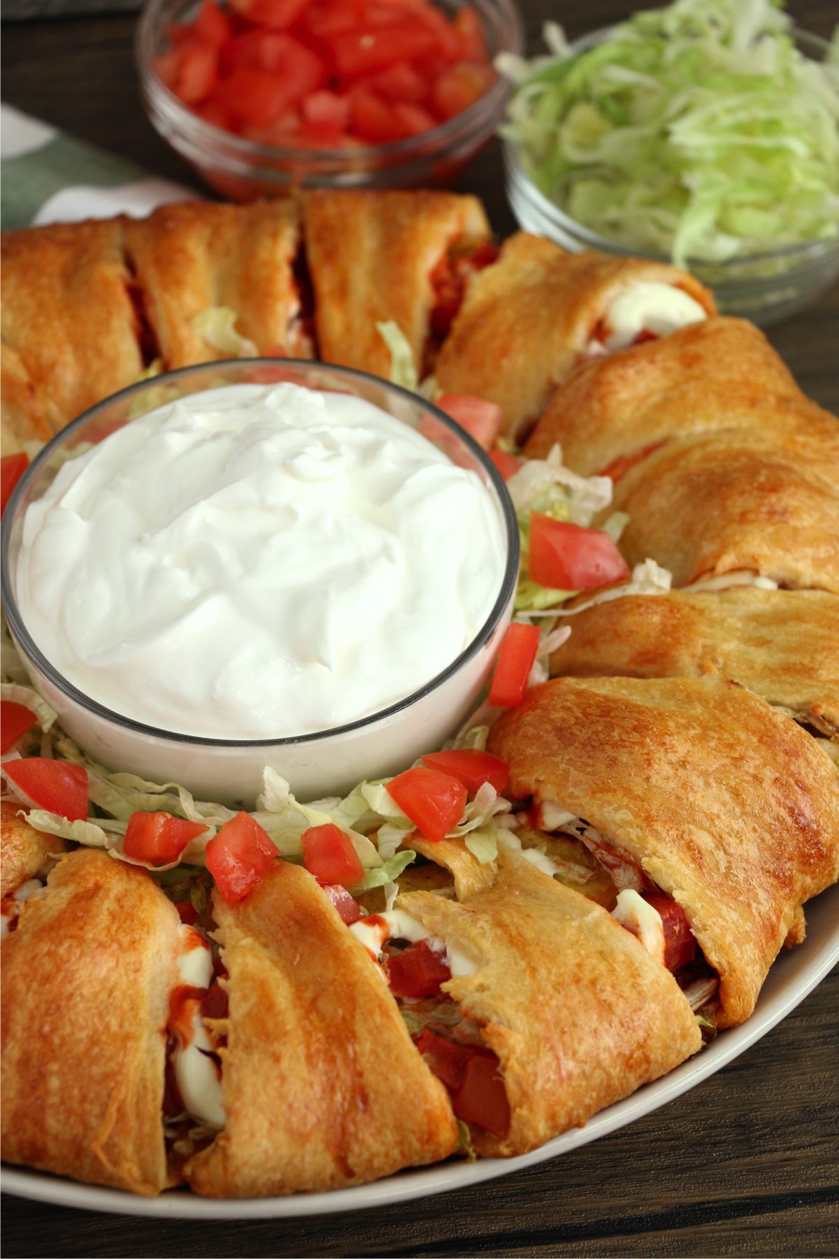 Ground beef, taco seasoning, and your favorite taco toppings are all wrapped up in a golden brown crescent ring and waiting to be devoured. This is the perfect recipe for Taco Tuesdays or even game day!