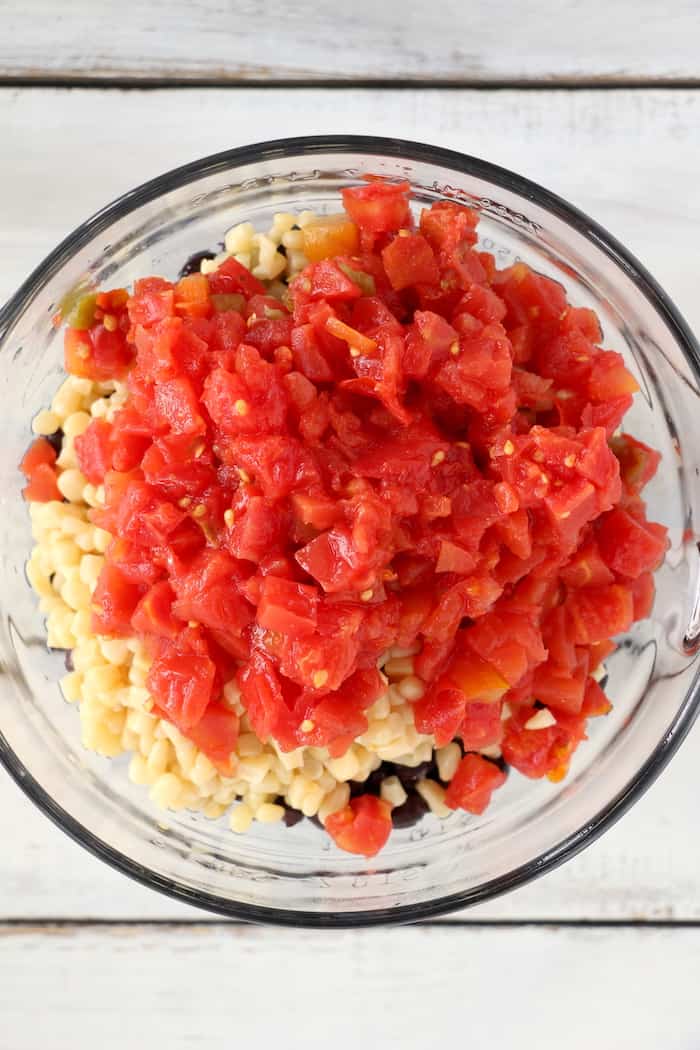 The shoepeg corn and Rotel can be added without draining.
