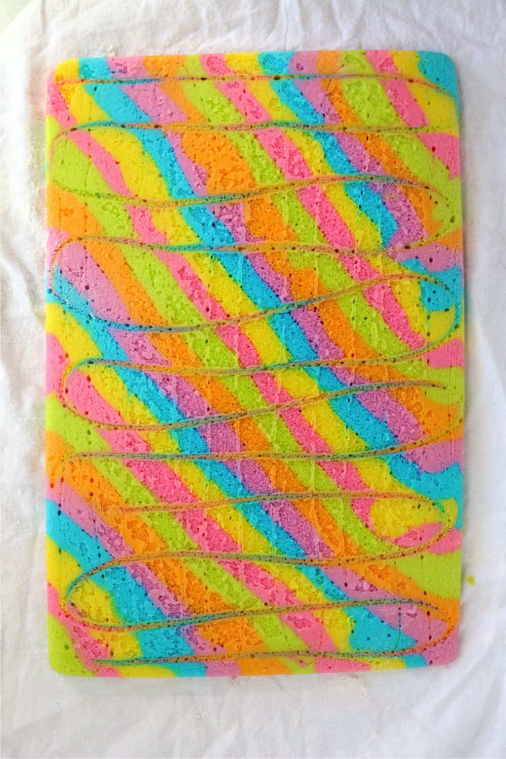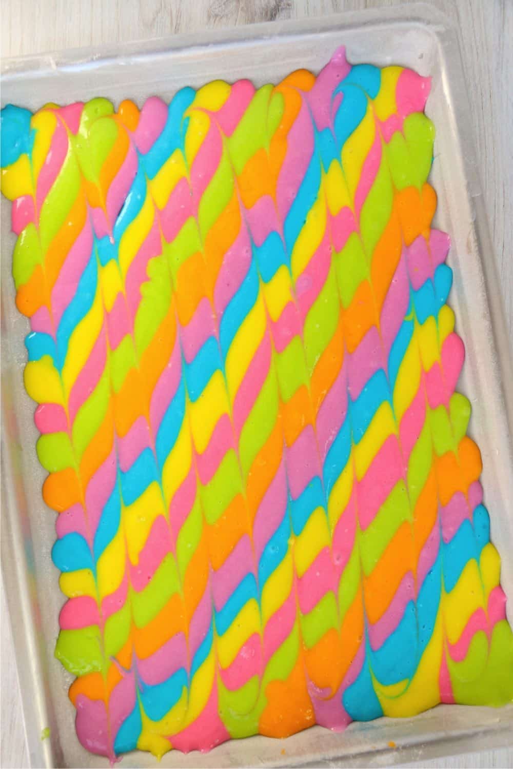 Grab your prepared jelly roll pan, and in a diagonal pattern, squeeze strips of each color into it until the pan is filled. If you have batter remaining, you can go back and fill in as needed. When all the bags are empty, gently shake the pan to even out the cake batter. Using a toothpick, draw swirls in the batter to create a tie dye look.