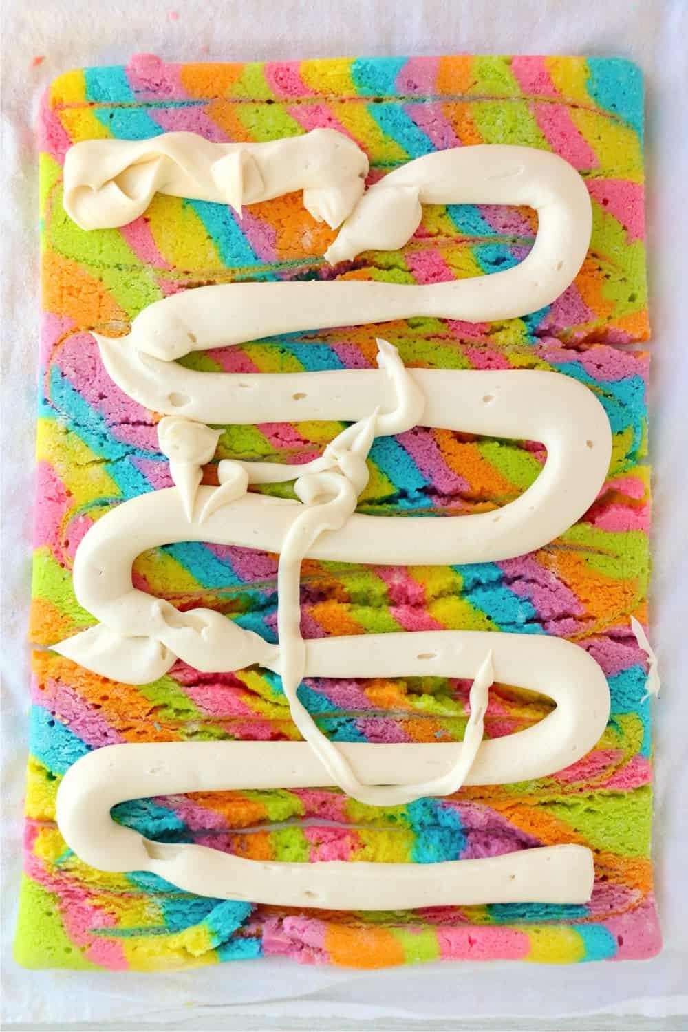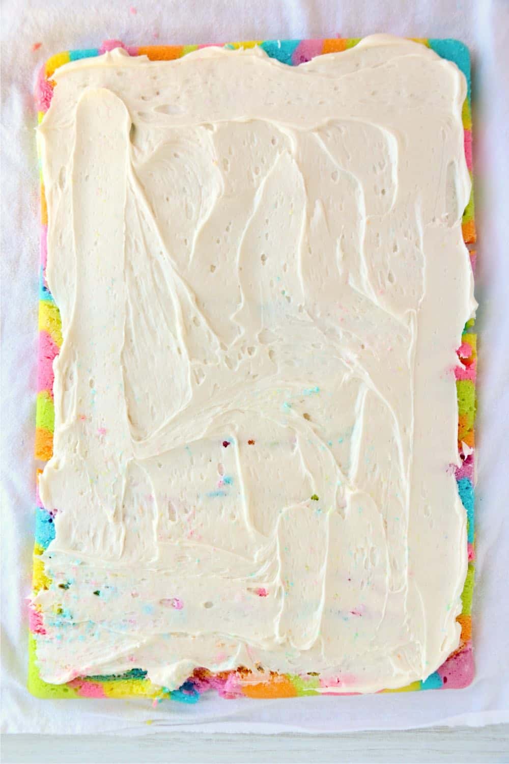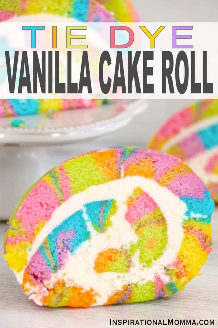 This Tie Dye Vanilla Cake Roll is a sweet, rich, and decadent roll cake filled with homemade buttercream frosting. Perfect for parties!