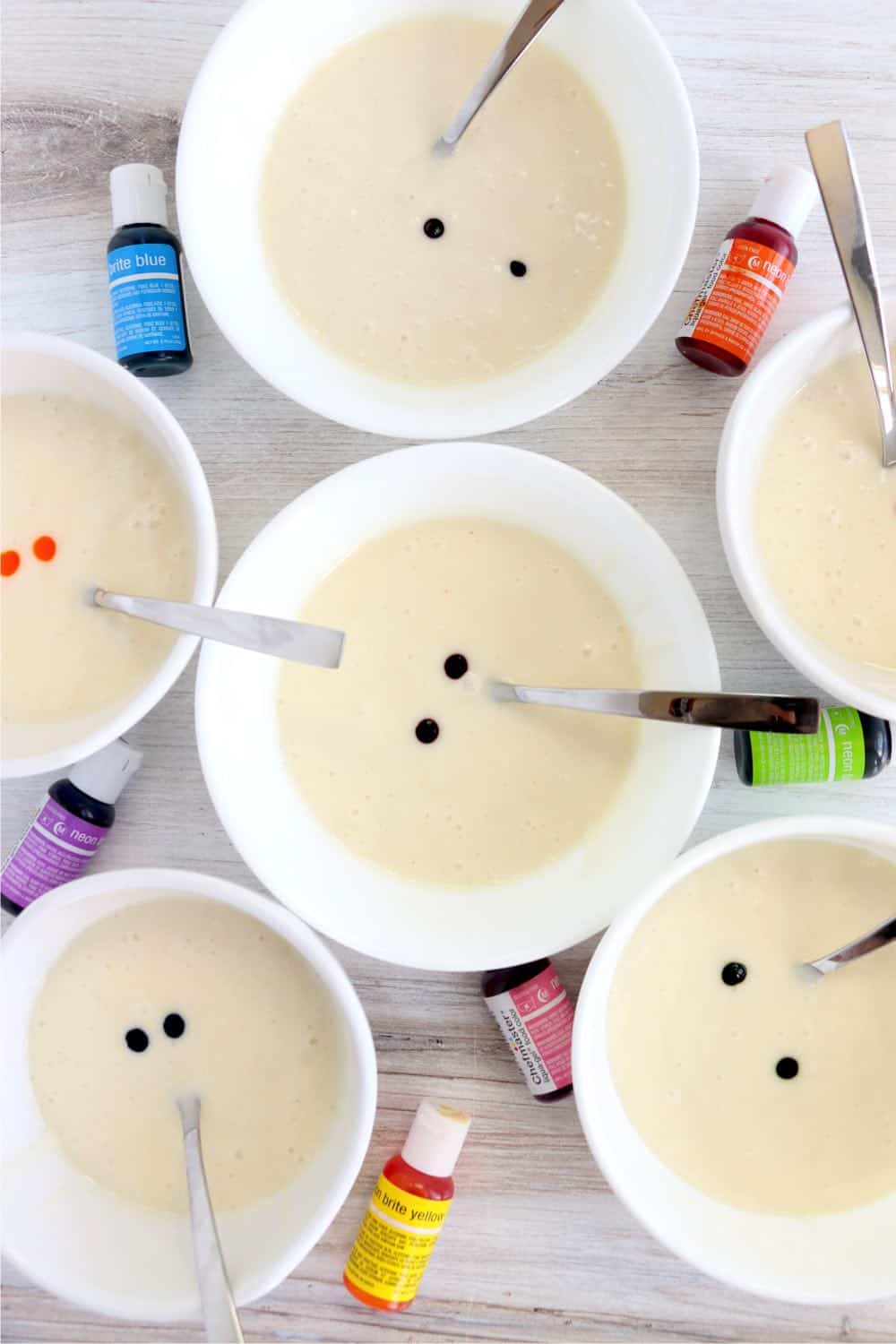 Next, add food dye to each bowl and mix until the colors are uniform throughout. I am a huge fan of these neon gel food colors. They produce gorgeous, vibrant colors that are irresistible!
