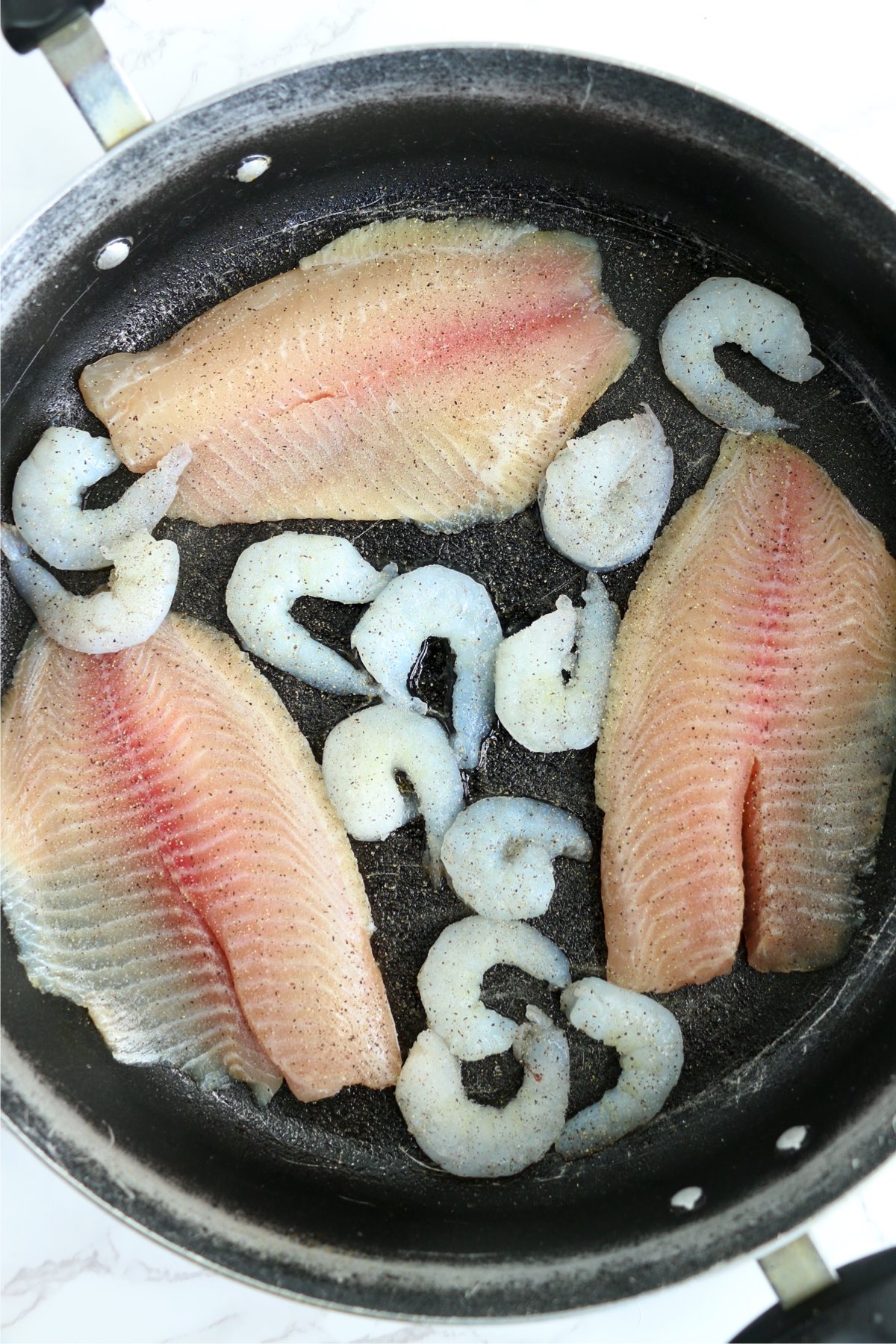 Step 2: Season tilapia and shrimp with salt and pepper.