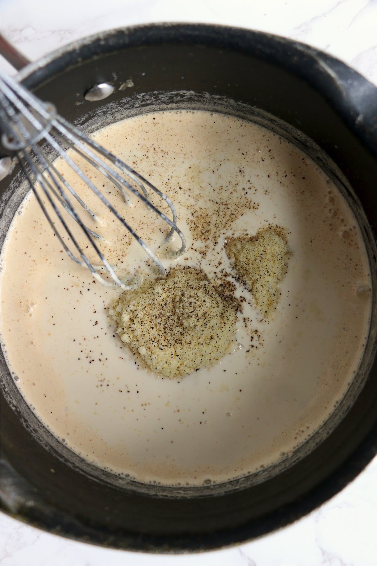 - Reduce heat to low and whisk in parmesan cheese, salt, and pepper. Be sure to stir often.