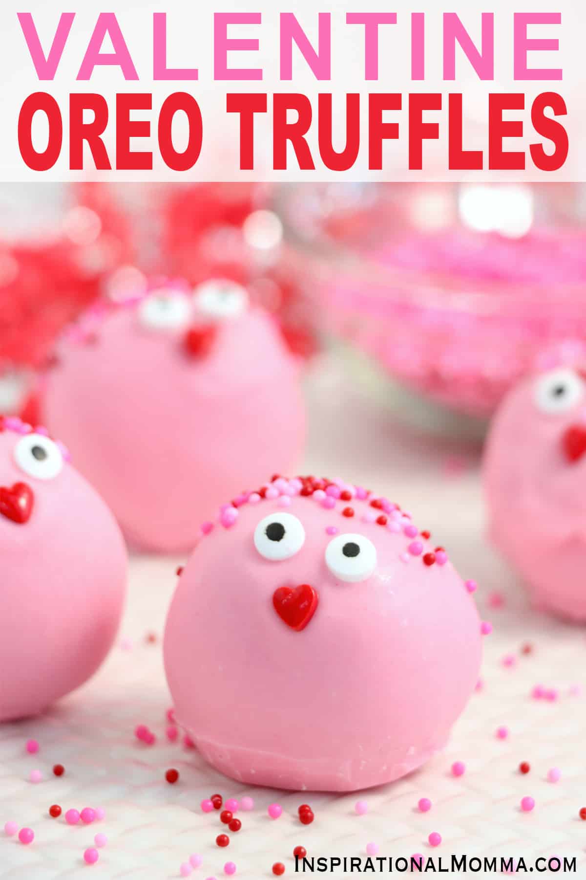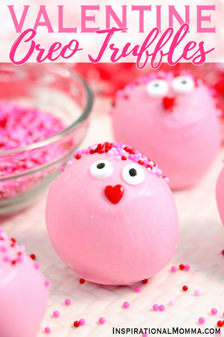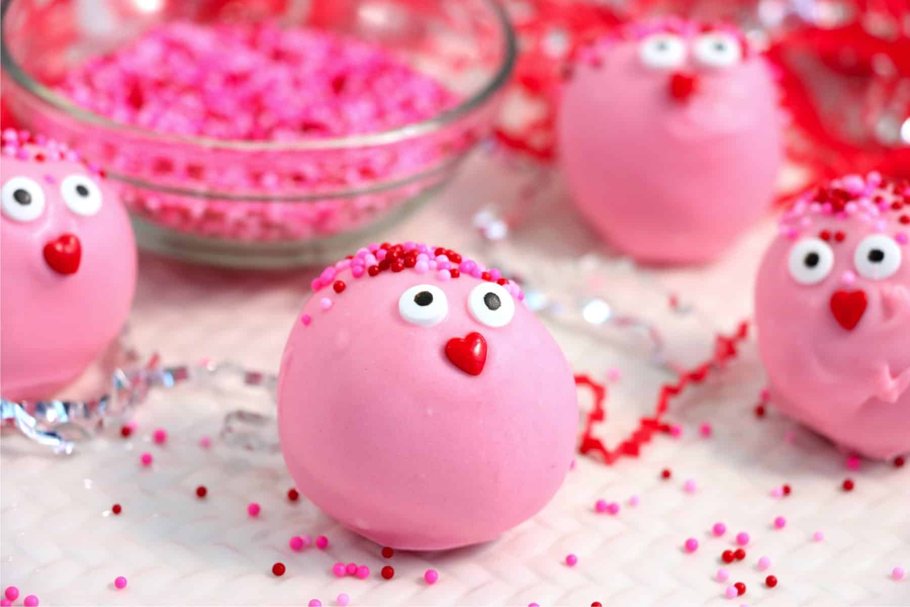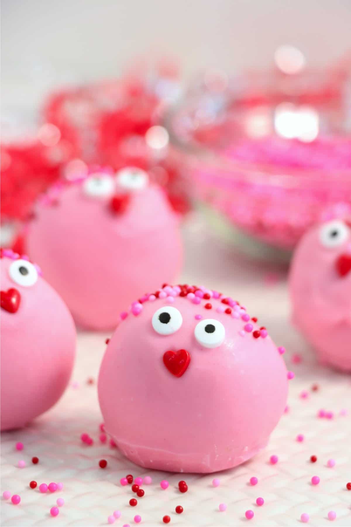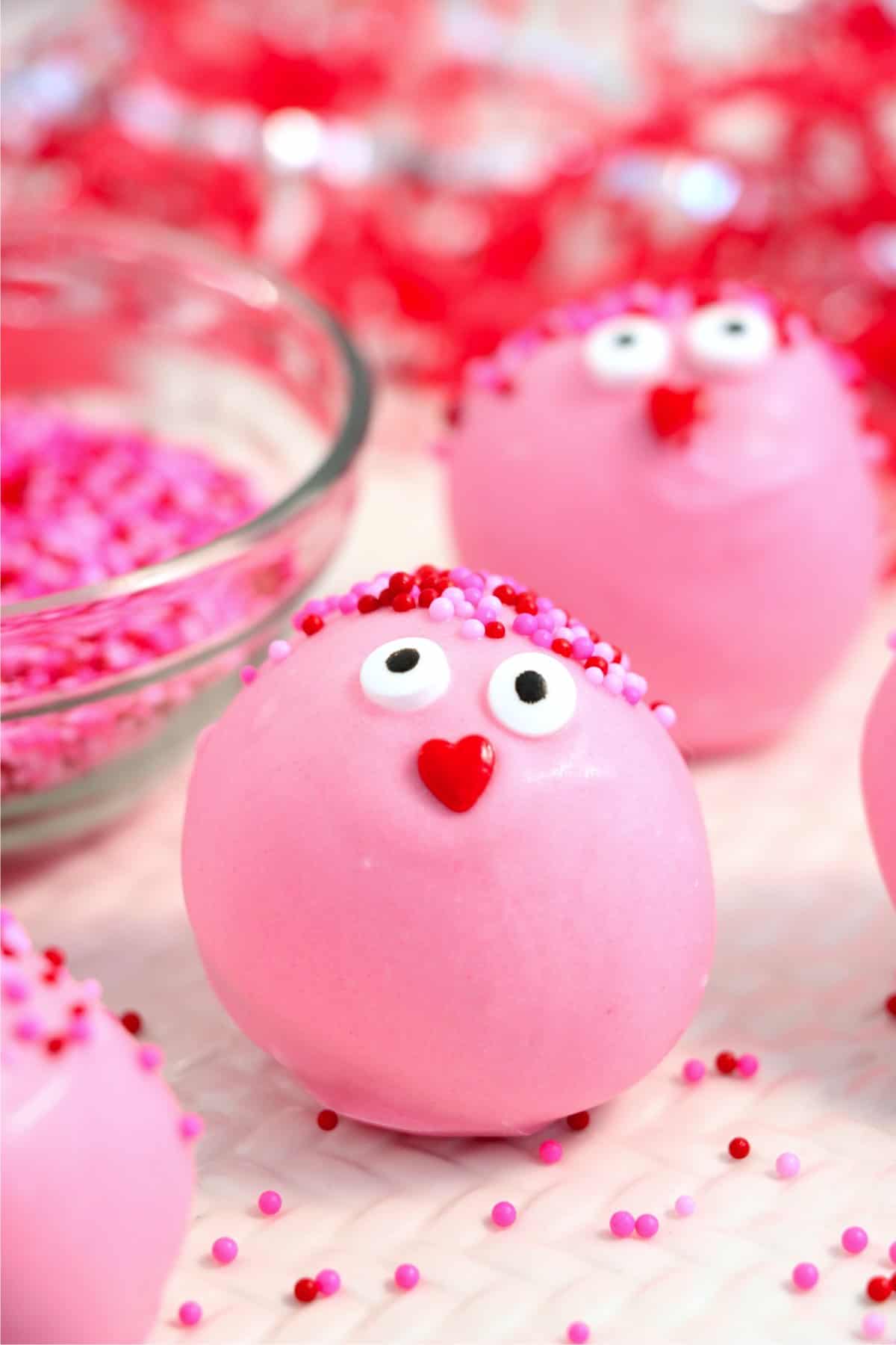 These Valentine Oreo truffles are the perfect treat for family, friends, or that special someone. Their Oreo ball center is coated with pink candy and sprinkles, then decorated with edible eyes for a super cute finish.