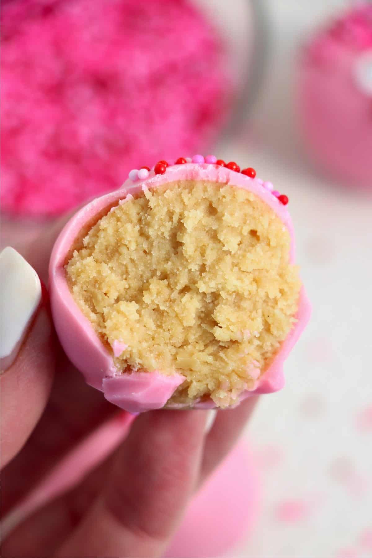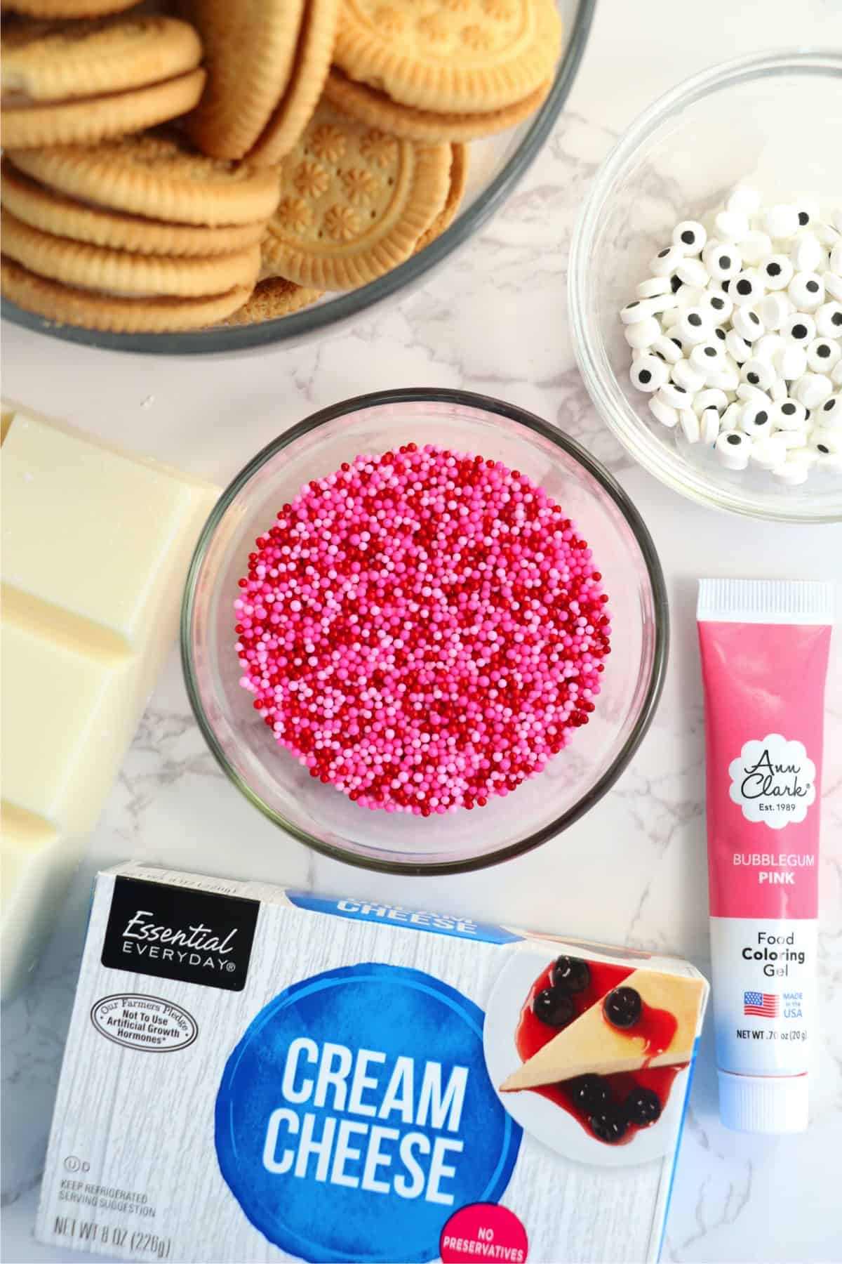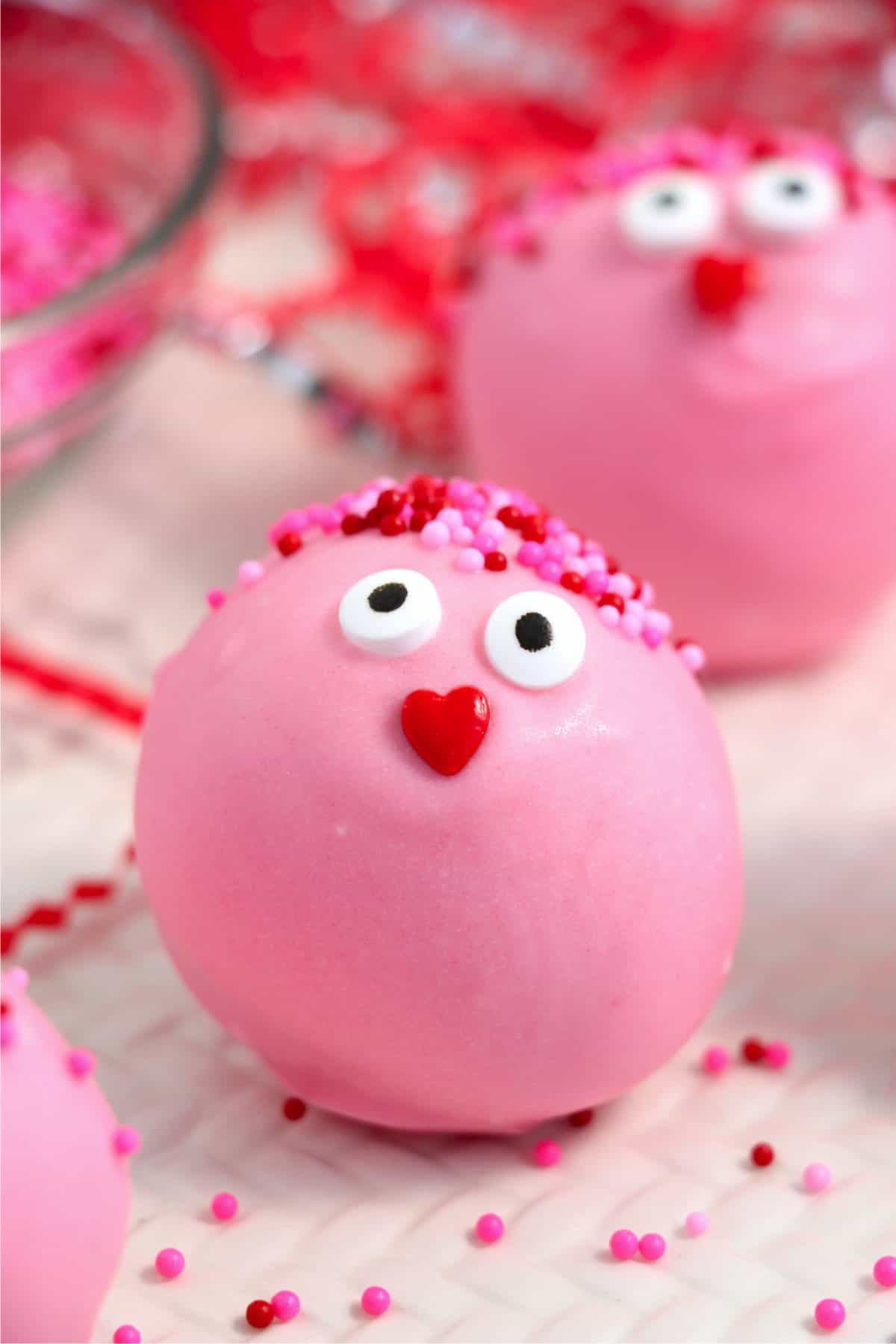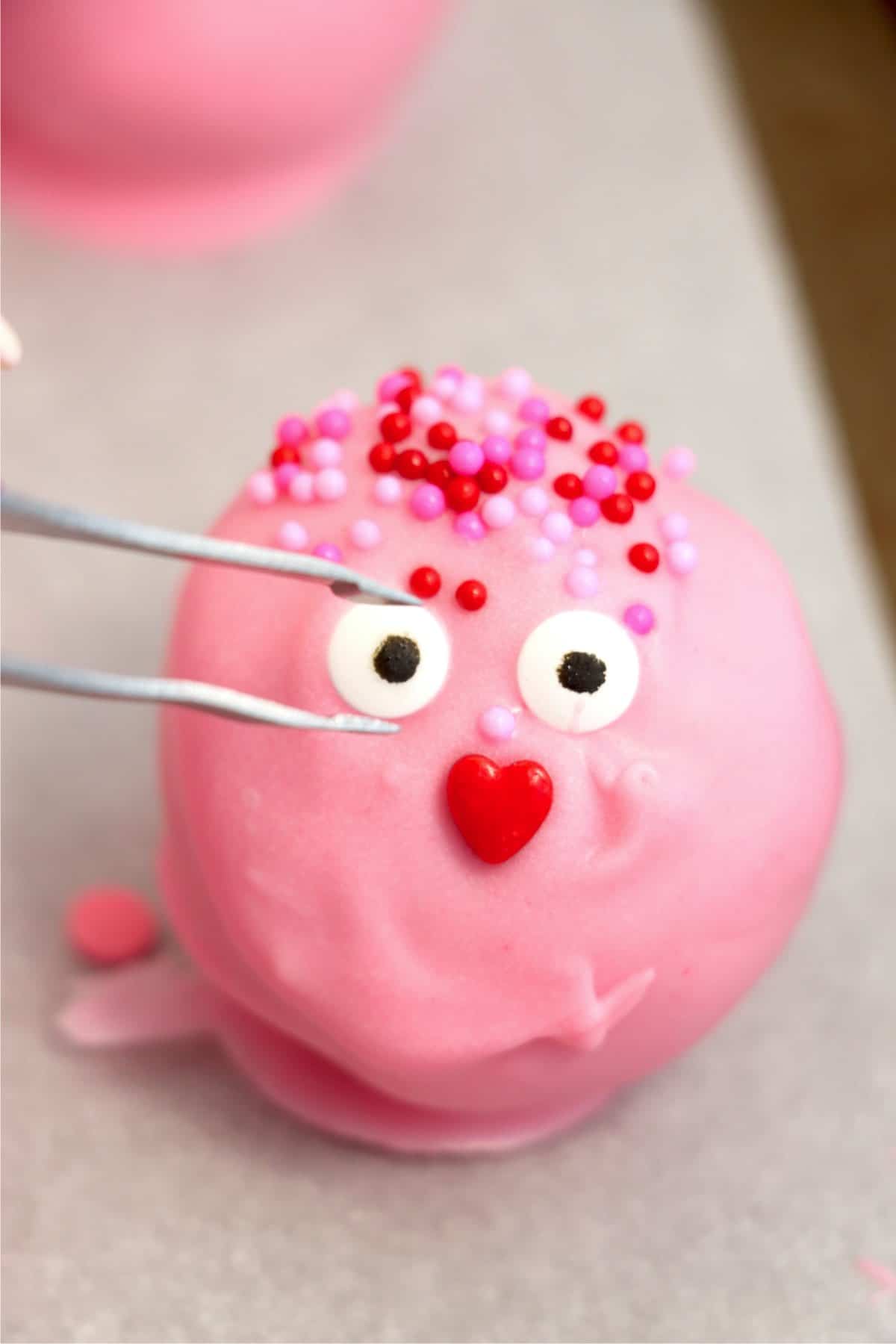 These Valentine Oreo truffles are the perfect treat for family, friends, or that special someone. Their Oreo ball center is coated with pink candy and sprinkles, then decorated with edible eyes for a super cute finish.