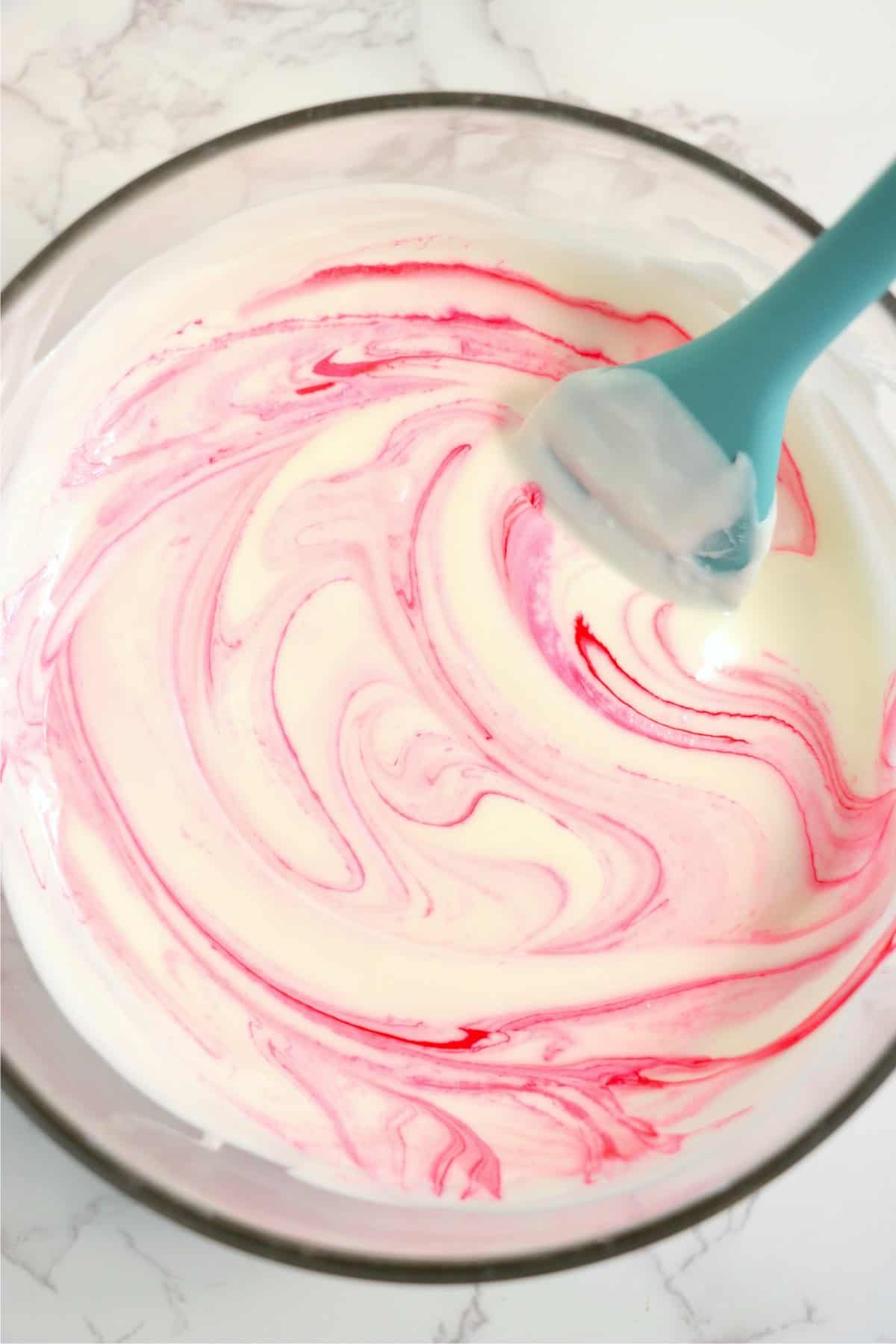 4: Melt the almond bark in the microwave, then mix in pink gel food coloring to your desired color intensity. Thin with a bit of coconut oil if the bark mixture is too thick.